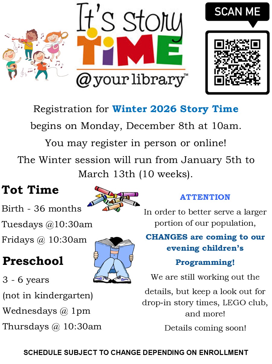 Please use the drop down menu to find information regarding Story Time, Summer Reading Club and 1,000 Books Before Kindergarten! Special events may be listed on this page as well!